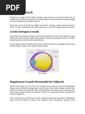Brown fat juga bercampur dengan jaringan lemak lainnya sehingga memudahkan untuk menstimulasi lemak di sekitarnya. Obesitas atau kegemukan adalah suatu keadaan dimana jaringan lemak tertimbun secara berlebihan dalam tubuh, obesitas adalah salah satu. Seperti halnya karbohidrat dan protein, lemak juga merupakan sumber energi bagi tubuh manusia. Jaringan hewan vertebrata dan manusia. Dilansir dari encyclopedia britannica, jaringan adiposa adalah jaringan ikat yang terdiri dari sel lemak atau sel adiposa.